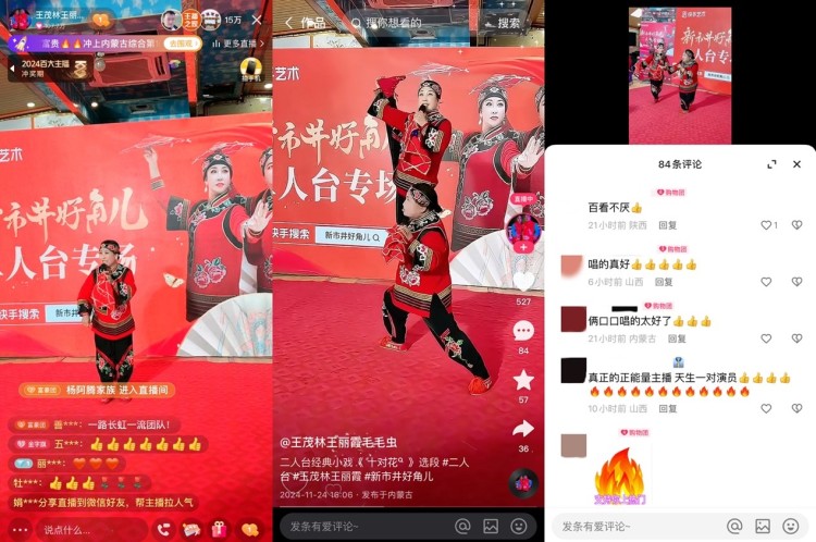 2019年,王丽霞辞掉国营剧团的工作,带娃之余在快手直播间秀唱功、觅知音、与粉丝互动,收入比上班还要可观。2021年,王茂林也决定离开国营剧团,带着精挑细选的班底正式入驻快手。在内容创作上,他们坚守艺术本体,为二人台融入漫瀚调、山曲儿等元素,并增加了更多趣味即兴表演。同时,两人善用观众与主播即时互动、双向反馈的特性,主动从“我演啥你看啥”转变为“你看啥我演啥”。在快手固定开播,让粉丝天天能听到喜欢的剧目,二人台的魅力也走进了年轻人的心。