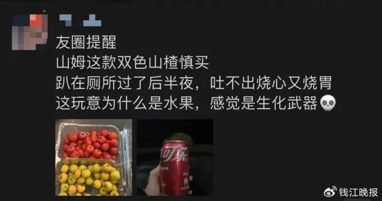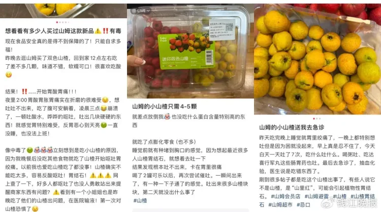记者在社交平台上查询后发现,不少网友发文吐槽山姆超市在售的“迷你双色山楂”,称吃完几个就会胃胀反酸、甚至胃结石。