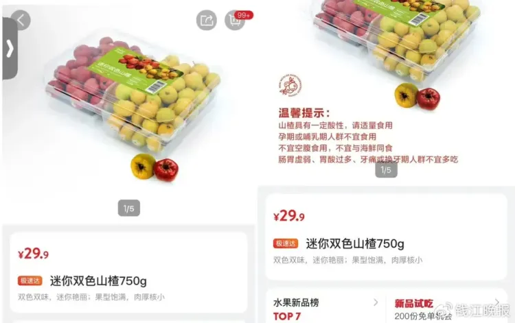 记者查询发现,这款“迷你双色山楂”售价29.9元,品种为红山楂和黄山楂。