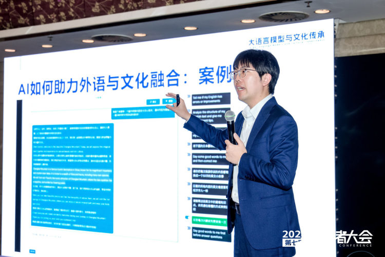 大模型时代呼啸而至,AI不再是科幻电影中的虚妄想象,而是现实生活中的变革力量,社会环境的变迁也带来人才培养需求的变化。作为在跨语言教育领域有着深厚的学术背景和经验的专家,北京语言大学国家语言服务出口基地代表、副教授韩林涛在主题演讲中,探讨了人工智能时代如何培养对外文化传播的“守门人”。韩教授强调了在AI技术日益发展的时代背景下,呼唤懂语言、文化、技术的复合人才,他表示:“要打造利用AI技术辅助外语学习的新平台,让学生能够以互动和多模态的方式学习外语,培养出具有全球视野和深厚文化理解的中华文化‘守门人’”。