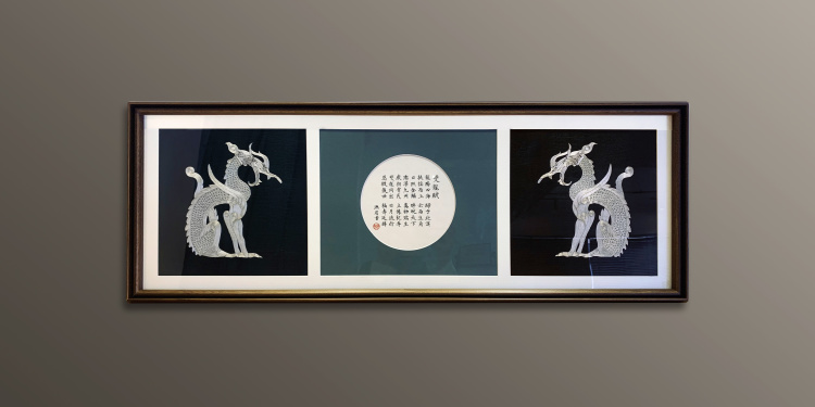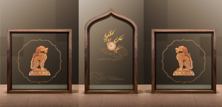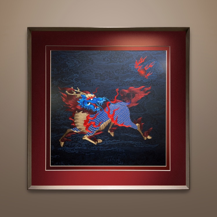 王晖独创的蜀绣定制品牌,解码中国传统图形符号,提纯国学中的“祝礼文化”,大量融入工笔画、版画、书法、镶嵌等跨界艺术表现手法,突破传统表现维度,让作品在不失传统审美的前提下更具现代性与表现张力。其中,中华神兽系列的创作便是巧妙融合工笔画、剪纸、木版画、编织等多种民间艺术表现手法,并辅以创新的装裱工艺,成功融入日常家居场景的一次生动实践。