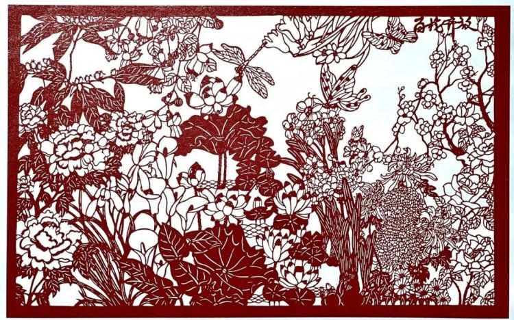 作品用4万余刀刻画出春、夏、秋、冬各种花朵共二十余种,一百余朵。意在表现中华美术的百花齐放多姿多彩。该作品融合了传统剪纸与现代艺术剪纸的精湛技艺,令人感受到剪纸艺术震撼大气一面。