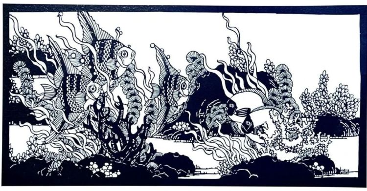 作品运用现代艺术与剪纸艺术相结合的角度,在剪纸技法中加入西方画的设计思维与构图思路,在意象和写实之间找到独具特色的表现效果。画中海草随水摆动,鱼儿悠然自得,画面栩栩如生。