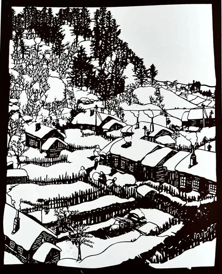 作品用极具个人特色的技法,阴雕线条技艺将“雪”表现得惟妙惟肖。描绘出东北“雪乡”的特色美景。村落、人物与自然结合巧妙。既有大巧不工的洒脱技艺又有细节满满精工刻画。