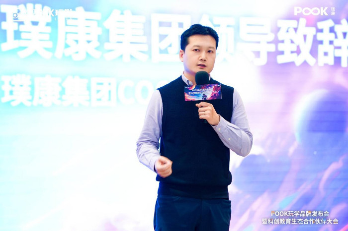 大会开场,璞康集团COO张长伟发表致辞。他对到场嘉宾表示了热烈欢迎,并表达了璞康集团创立“POOK玩学”品牌的初衷和对科创教育的重视。