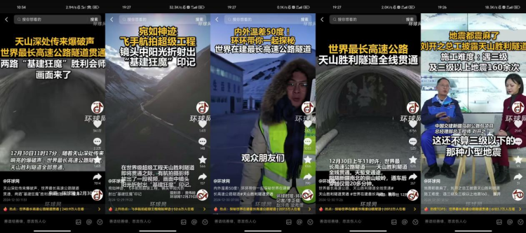 #天山胜利隧道贯通 #世界最长高速公路即将贯通 #探秘世界在建最长高速公路隧道 #飞手航拍超级工程宛如神迹 等5个话题登上社媒热搜,其中#世界最长高速公路隧道贯通 冲上抖音热榜top3。