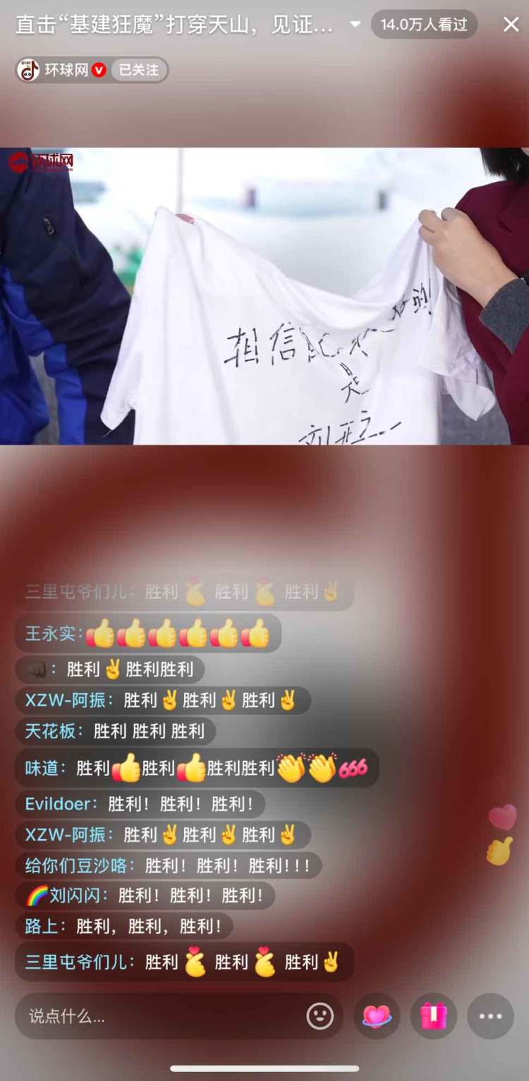 直播中抽取的互动奖品“天山胜利隧道三洞齐通纪念T恤”,也吸引了广大网友在评论区集体刷屏“胜利!胜利!胜利!”