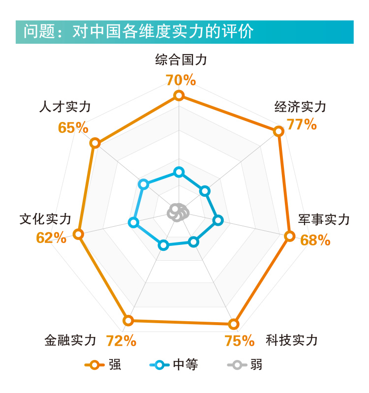调查数据显示,中国的综合国力及各项实力被国外受访民众普遍评价为“强”。经济实力强获认可比例最高,达77%;其次为科技实力(75%)和金融实力(72%)。年轻群体对中国科技实力的评价更高。非洲国家、金砖国家、中东国家、发展中国家有超过七成民众认为中国综合国力强;该比例在东盟国家和欧洲国家超过六成,在发达国家超过半数。