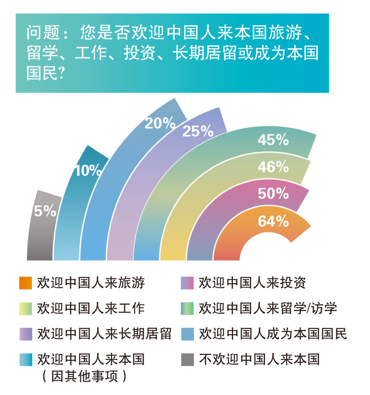 关于本国与中国关系的未来变化,62%的国外民众希望变得更好,26%希望保持不变。非洲国家希望本国与中国未来关系更好的比例超过八成;发展中国家、中东国家和金砖国家的该比例为近七成;东盟国家超过六成。95%的国外民众欢迎中国人到访本国,其中,旅游最受欢迎(64%),其次为投资(50%)、工作(46%)、留学/访学(45%)。中国优化实施过境免签政策后,近七成受访者表示未来愿意来访中国。