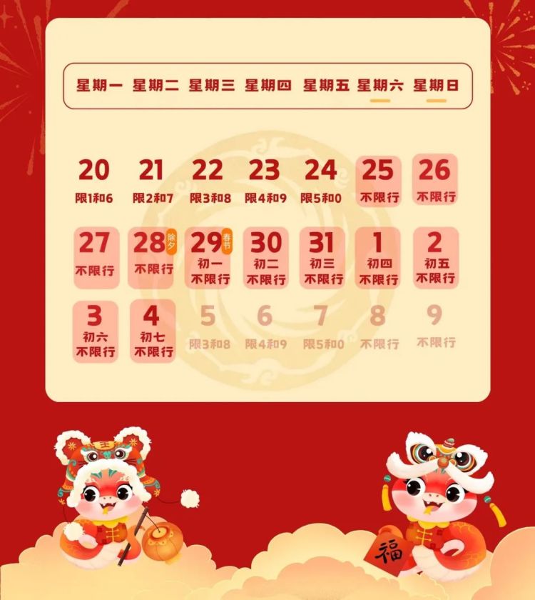 为方便市民出行与返乡,让除夕回家不再是一场与时间的赛跑,2025年1月27日,成都市取消机动车尾号限行,与春节放假调休相连,1月25日至2月4日,连续11天不限行,方便群众从容安排、安心享受春节假日旅程。