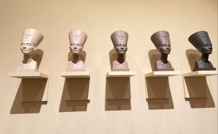 如果从这个角度来讲,这次展览展出的艺术家Fred Wilson创作的灰色区域(Grey Αrea)具有更深层次的意义。该作品一组五件雕像呈现的不是非黑即白的对立,而是白色、浅沙丘色、小麦色、深咖啡色、黑色五种肤色。虽然依然是现当代的肤色决定种族的思维,但探索了奈芙蒂蒂肤色光谱的可能性,开启了对话、包容、整合、团结的可能性。