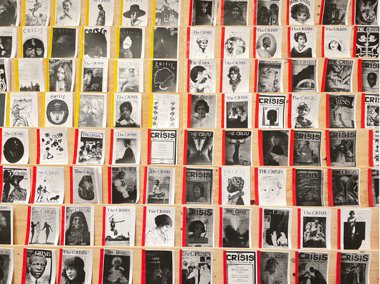 The Souls of Black Folk),里面有两个经典说法。第一,20世纪是肤色黑白对立的时代(the color line);第二,双重意识(double consciousness),指黑人无法真正认识自己:只能通过他者(白人)的眼光看到自己,只能在外界轻视和同情的心态下去测量自己的心灵,造成内心的割裂和冲突,无法自信地认识自己的价值和潜能。展览空间里一个小的杂志陈列室,摆放着杜波依斯主编的期刊《危机》(