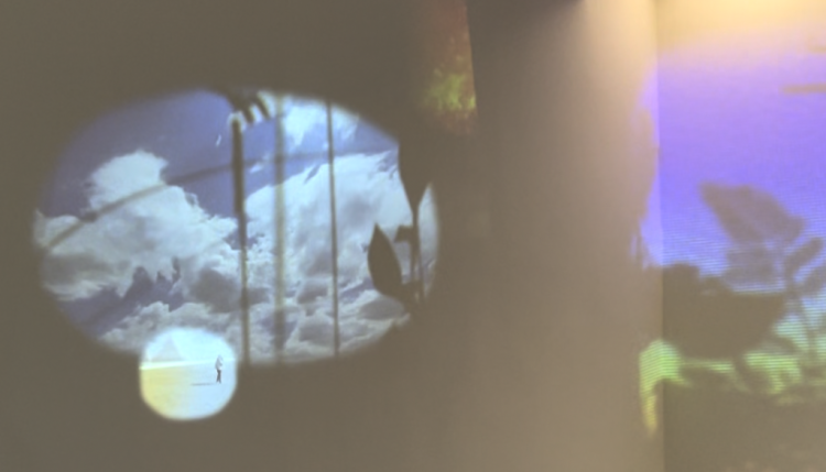 古根海姆博物馆2023年展出的Sarah Sze作品,上面的小视频呈现流动的白云,下面的小视频聚焦金字塔和附近的女子