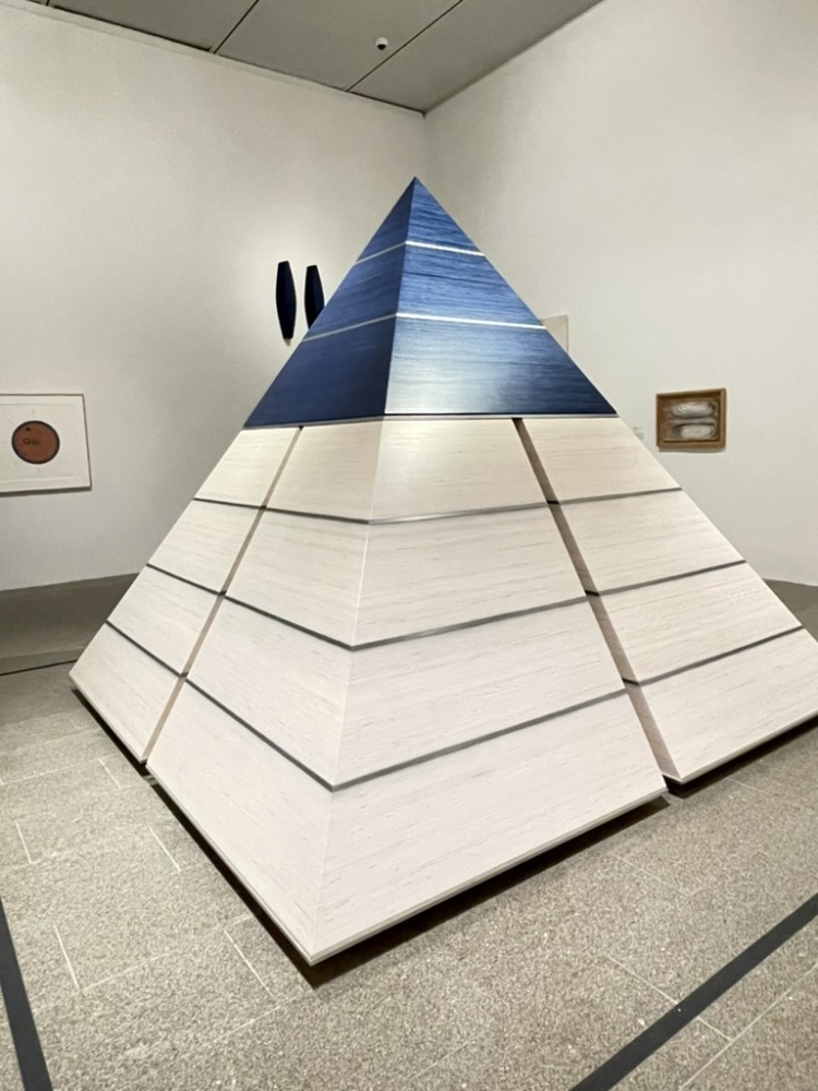 除著名人物外,古埃及物质遗存最为人所知的即为金字塔。这次展览也在一个展览室中心位置放置了一个现当代抽象派艺术金字塔。华裔建筑师贝聿铭设计的卢浮宫主庭院里的玻璃建筑,是对金字塔的经典借用。所以,这些文化元素不只属于一个族群,可以在艺术上给所有愿意去了解它们的人以灵感和启迪 。艺术家Sarah Sze(施肇基后人)也在她的作品里使用过金字塔等元素,空中白云的流动、人在屹立数千年的金字塔附近奔跑,通过数个视频同时播放的形式启发观者去思考短暂与永恒、变与不变等问题[6]。
