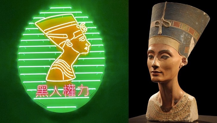 左:展厅里的一幅作品:奈芙蒂蒂·黑人权力 [Nefertiti (Black Power)], by Awol Erizku。藏于波士顿艺术博物馆,作者现场拍摄,其余图片除非特别说明,均为作者现场拍摄。 右:奈芙蒂蒂雕像,现藏于柏林新博物馆,下文会有更多相关内容。