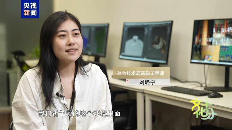 总台技术局高级工程师 刘璐宁:总台技术局是依托国重实验室大场景扫描重建的这项技术,对天坛祈年殿进行了高精度的模型的采集和制作工作。通种虚实融合拍摄VP的一种技术手段,让演员从1号厅的现场可以无缝穿越到三维的虚拟影像当中,仿佛走入祈年殿的环境里面,与他身边的这些元素,一些建筑的结构进行一种交互。