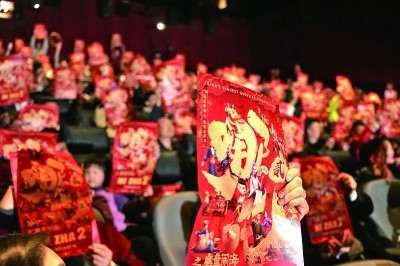 2月8日,人们在美国洛杉矶举行的《哪吒之魔童闹海》北美首映礼上举起电影海报。新华社发