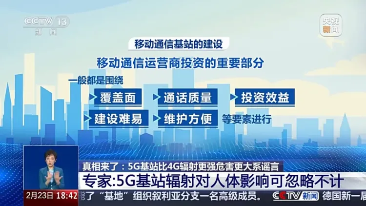 北京邮电大学教授 彭木根:我们国家现在为了保证电磁安全,通过无线电管理委员会,严格地进行电磁的管控,避免对老百姓产生不可控的辐射,这一点是我们国家一直在坚守的。我们国家任何一个基站要入网,要最后能够商用,它必须符合相应的电磁的一些标准,一些辐射的标准,一些我们的协议的标准,还有一些接口的标准,只要是通过国家认证的,都是安全放心的,不会说出现某个基站突然功率增加100倍,变成一个大的类似激光器一样,天天对人体产生辐射,那是不可能的。