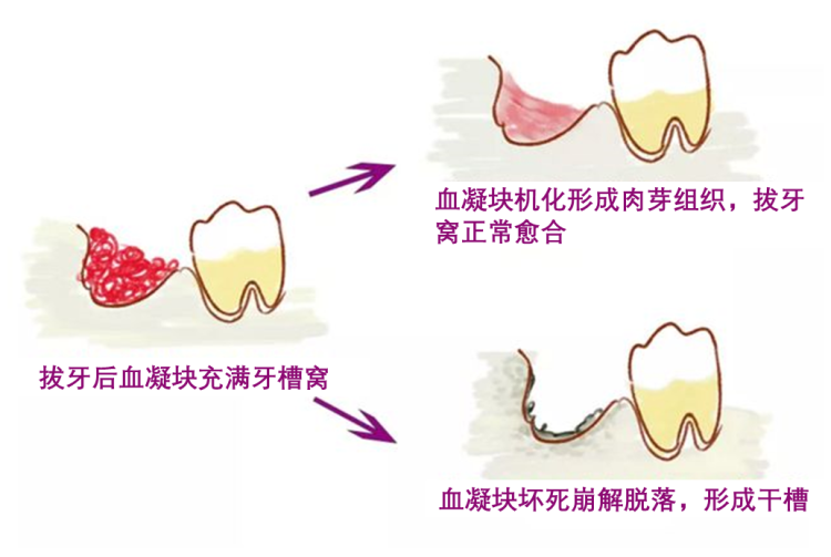 如果血凝块脱落,牙槽骨就会暴露在充满细菌的口腔中,一旦骨壁发生感染,就成了干槽症。