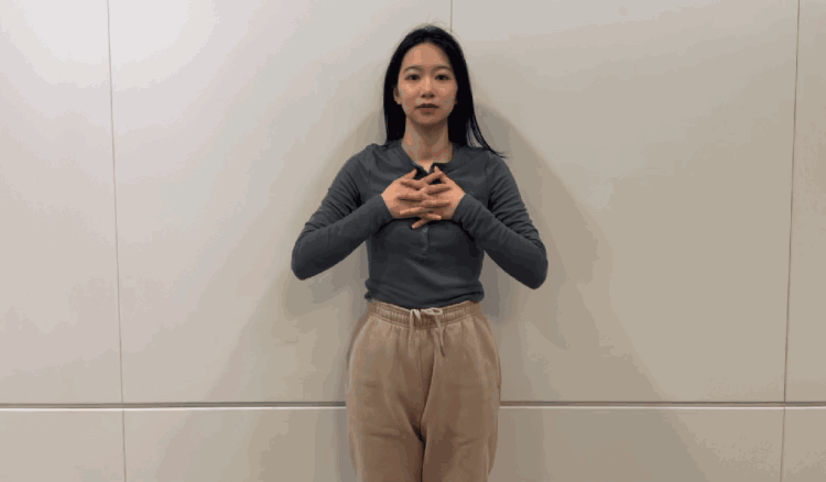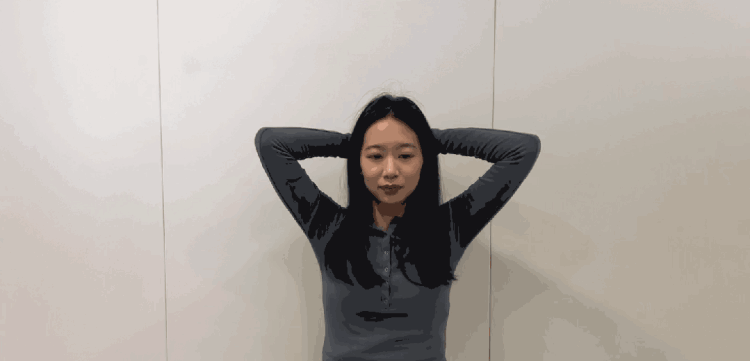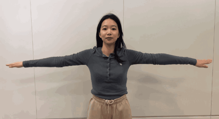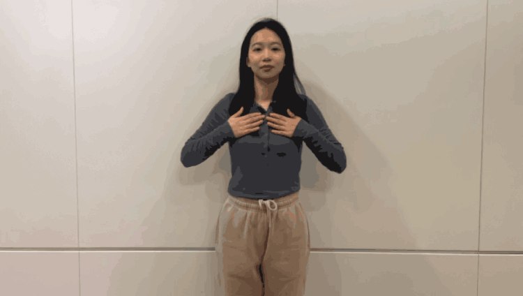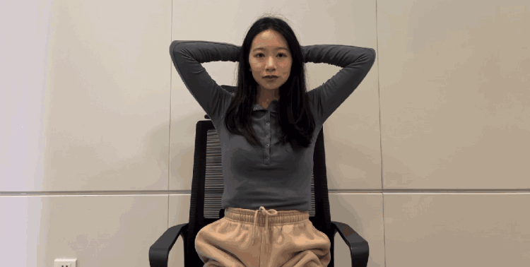 将双手交叉放在头后,吸气;边呼气边将双手掌向上伸直,感受胸部肌肉被牵拉;呼气到尽头,吸气时将手放回原位。