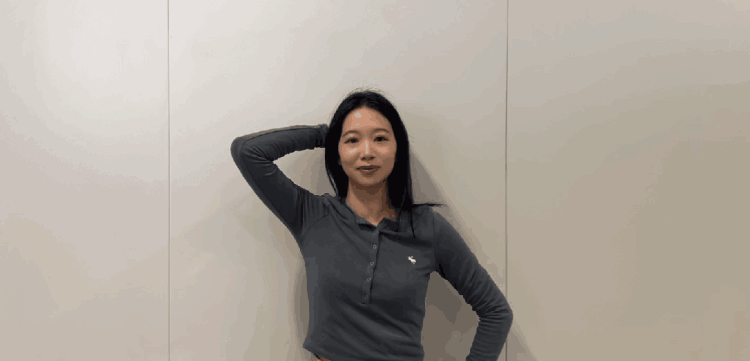 身体坐直,双手交叉抱于头部,先吸气;呼气的同时低头弯腰,双肘向内扣拢,感受背肌被牵拉;缓慢吸气,同时双肘打开,身体恢复原位。