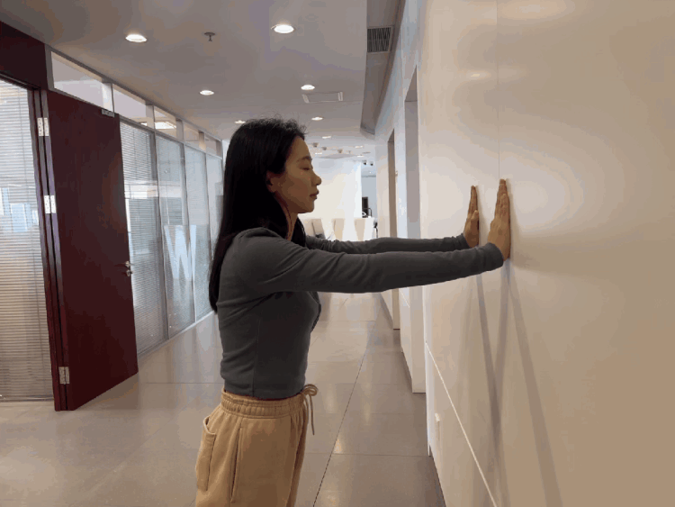 双脚开立与肩同宽;双手打开与肩同高,撑于墙面,上臂、腰背核心肌群发力;身体尽量呈一条直线,先吸气;呼气同时,身体下俯,吸气同时复位。