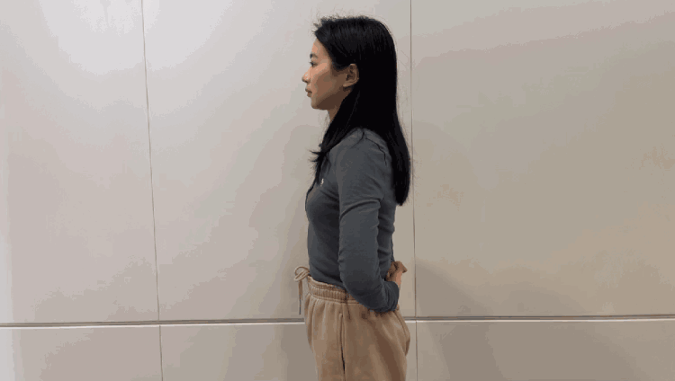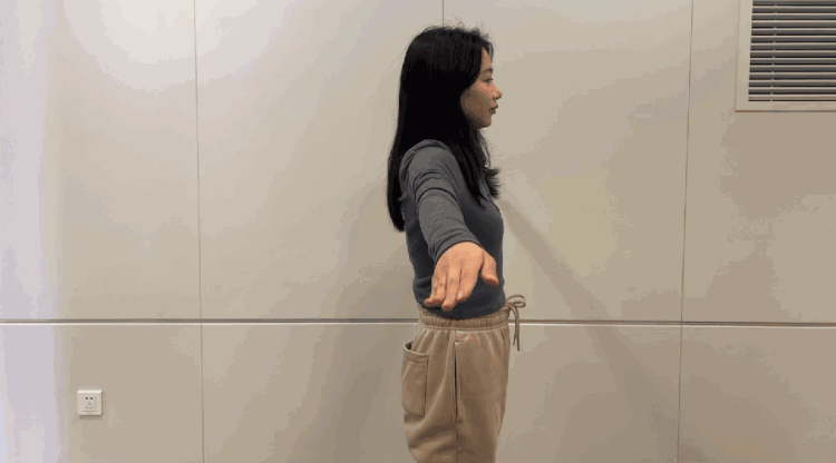 双手在背后交叉握紧; 边呼气边将双手远离腰部;下部胸廓和肚子向前挺起;呼气到尽头后返回原位。