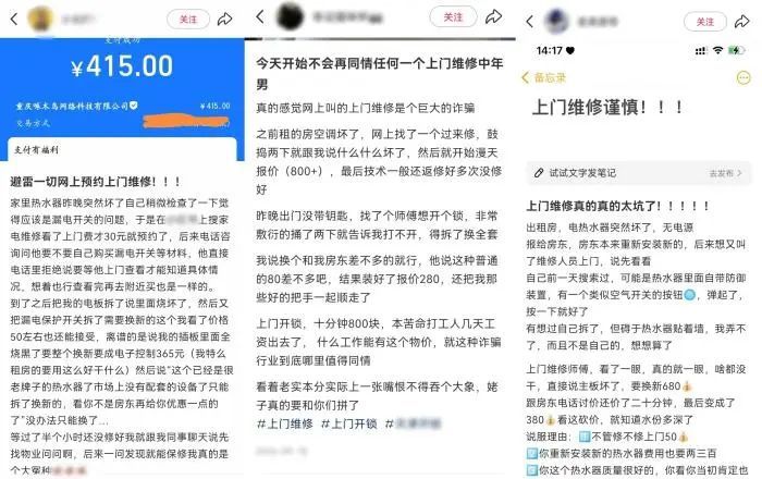 沫沫的经历并不少见。在社交媒体上搜索“上门维修”,可找到诸多类似案例。
