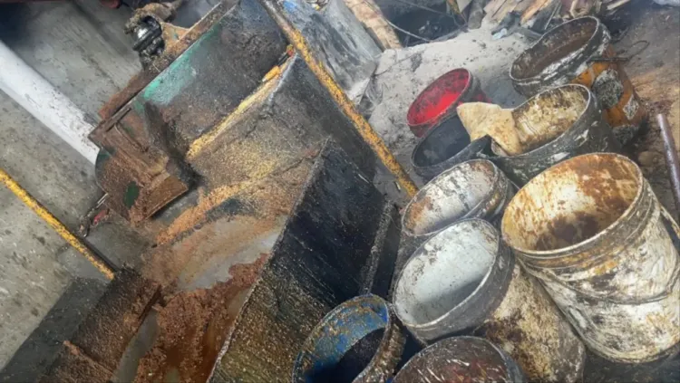 其中一名油贩子带记者参观了一家黑作坊炼油厂,这家隐藏在尿素加注站后的炼油厂,没有门头和招牌。车间里臭味难闻,地面污浊。