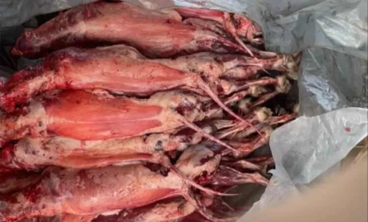 河北唐山市是貉子养殖大市。唐山乐亭县肉贩刘猛在某视频平台叫卖貉子白条,每天向国内多地发货,称客户以农家乐、饭店为主。他还将记者带到一处“东旭冷库”,冷库老板称里面库存有20多吨分割好的貉子腿。