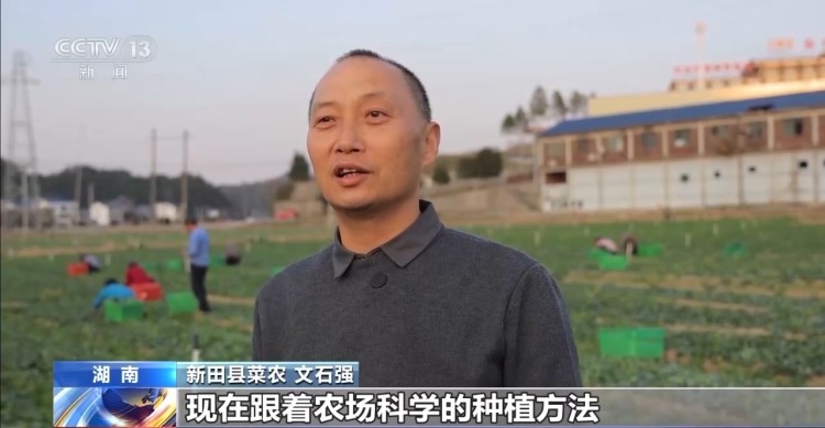 湖南新田县菜农 文石强:以前我们是传统的种植方法,现在不同了,现在跟着农场科学的种植方法,这个菜的品质上来了,(收入)比以前提高了两三倍。
