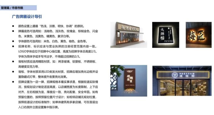 不允许一店多牌;不允许字体超过纵面宽2/3,横两侧留边;除国际国内连锁品牌,不允许用红蓝底色或字样;字体不允许用通用电脑体,应该有设计;牌匾内容不允许有广告内容;牌匾颜色不得简单一致,应有变化;牌匾一般应有亮化效果,商业街区和示范路必须亮化;材质选择应中高端;牌匾亮化时间应该服从主管部门要求时间;丧葬类牌匾应低调缩小,亮度要限制,此类门市只减不增;褪色破损亮化效果不佳的马上更换;牌匾内容不允许粗俗土气和哗众取宠;牌匾大小要与建筑和整条街区相匹配,与城市格调相统一。