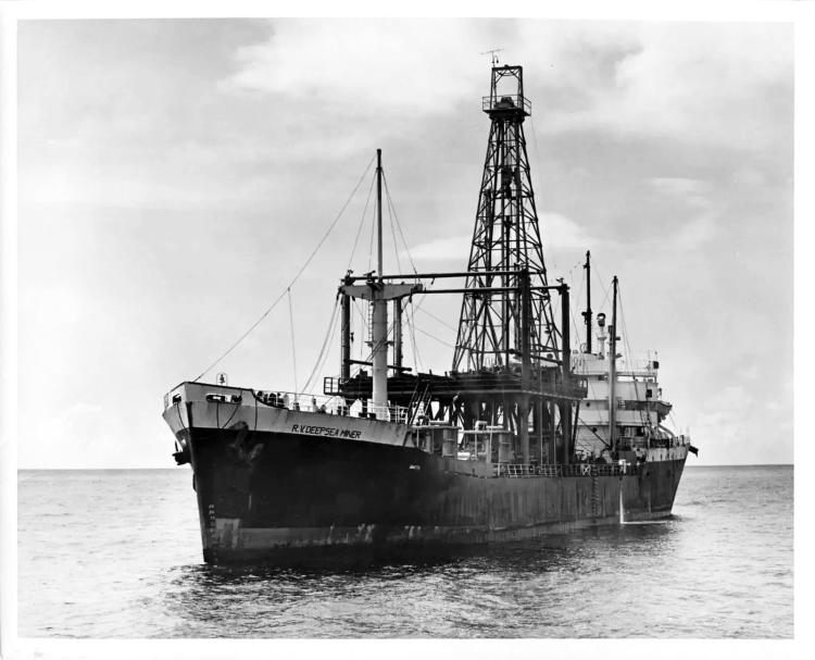 1970年7月,“深海采矿者”号(R.V. Deepsea Miner)船只在美国南卡罗来纳州海岸东南方向的布莱克海底高原上方作业,用机器从海底吸取大量土豆大小的黑色石头——锰结核。这种多金属结核含有大量矿物,如钴、镍和锰,它们是冷战期间制造战斗机的重要材料。