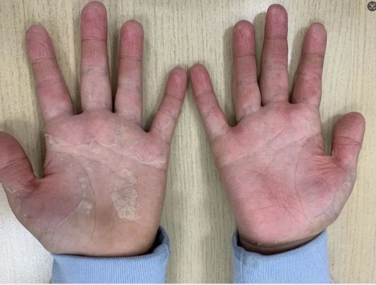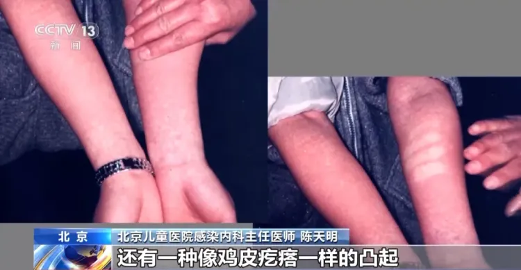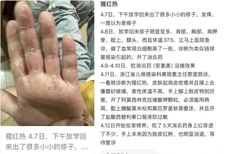 前不久,还有网友在社交媒体发文称孩子感染猩红热后出现发热情况,全身起疹子“像鸡皮疙瘩一样”,手部还出现了脱皮。
