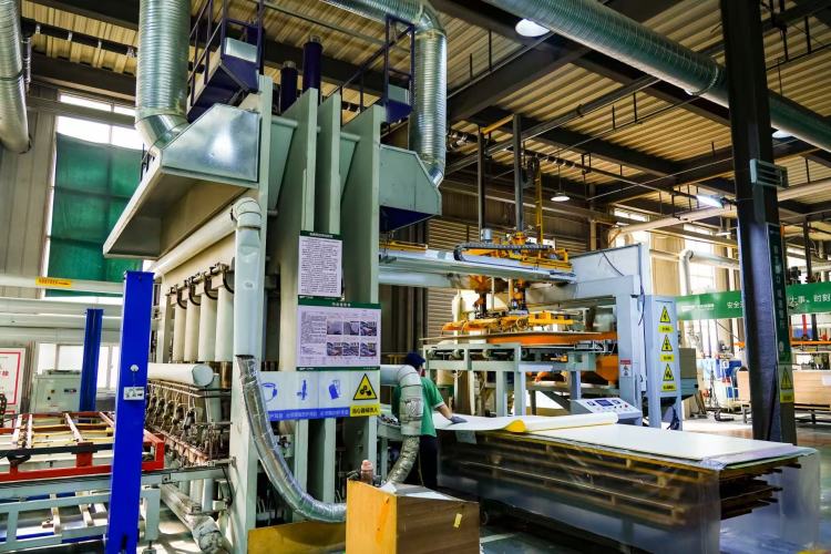 其中,日照工厂作为千年舟最早布局的智能工厂之一,背靠岚山港这一中国木材贸易的重要枢纽,进口优质原材,从源头把控产品质量,还率先实现了从原料入库到成品出厂的全流程数字化控制,更依托连续平压生产线、意大利格鲁巴斯环式刨片机、德国EWK尾气处理系统等全球先进设备,实现木材利用率高达99.5%、碳排放年减一万余吨,获评国家级绿色工厂称号,树立了行业绿色发展的“样板力量”。
