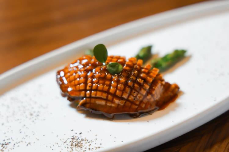 全场高潮当属全聚德“国宴盛世牡丹”烤鸭表演,中方主厨以非遗片鸭技法将烤鸭片成“牡丹花瓣”,外方主厨则以西式料理手法设计摆盘,传统果木烤鸭的酥脆皮脂与西式摆盘美学完美融合,交相生辉,让现场嘉宾深刻感受到全聚德在传承与创新中绽放出的多元魅力,生动诠释了 “美食无国界” 的无限可能。