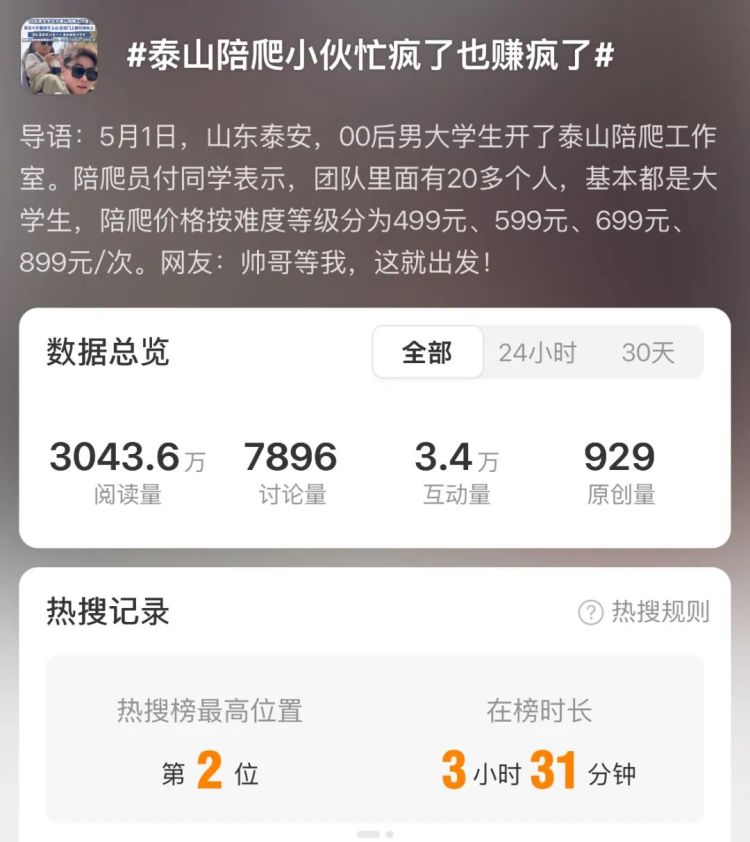 这个五一假期,#泰山陪爬小伙忙疯了也赚疯了#登上微博热搜。