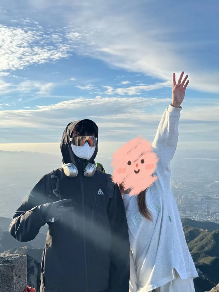 陪爬员天空(左)与选择陪爬的游客在山顶的合影。受访者供图
