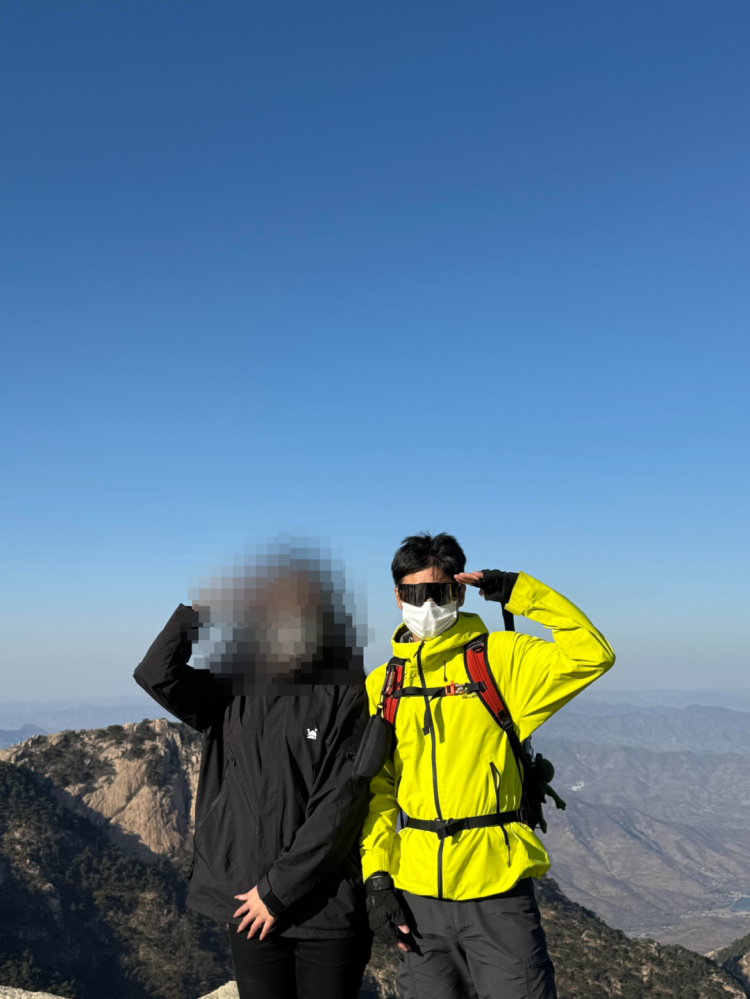 陪爬员陈无敌(右)与选择陪爬的游客在山顶的合影。受访者供图