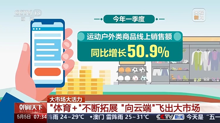 不只是空中运动飞出大市场,眼下,体育消费已成为拉动内需、促进经济增长的关键引擎。数据显示,今年一季度,运动户外类商品线上销售额同比增长50.9%,其中运动裤、运动夹克等细分品类同比增长分别达2.7倍、2.9倍,千元以上冲锋衣销售额快速增长。