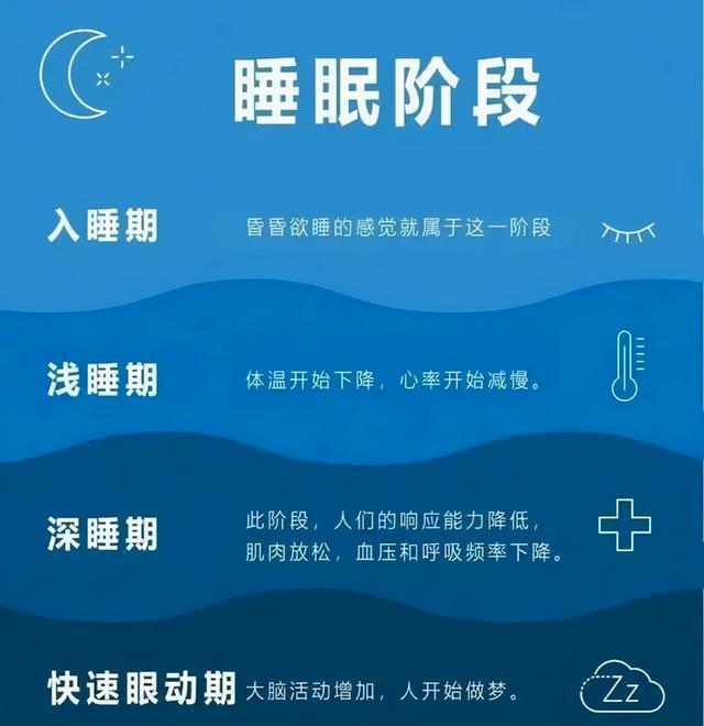 在回答这个问题之前,咱们先来认识一下睡眠的几个阶段——入睡期、浅睡期、深睡期、快速眼动期。