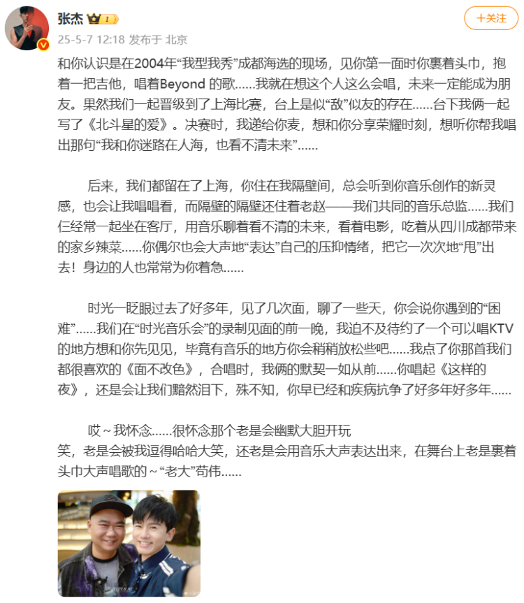 歌手袁成杰发文称:“那个曾经的抱着吉他唱着《海阔天空》的你,那个包着头巾还是满头大汗的你,那个总是嘲笑着自己是个灵活大胖子的你,那个爱唱歌爱音乐爱beyond的你,我会永远记得你,苟伟老大。”