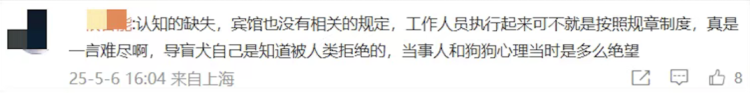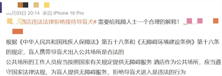 事件曝光后,#酒店拒绝导盲犬入住是否违法##导盲犬是工作犬并非宠物#等话题迅速引发社会热议。有网友表示,事件暴露出酒店接待机制的缺陷,酒店的拒绝行为不仅是认知错误,还可能触犯相关法律法规,应当承担相应责任。
