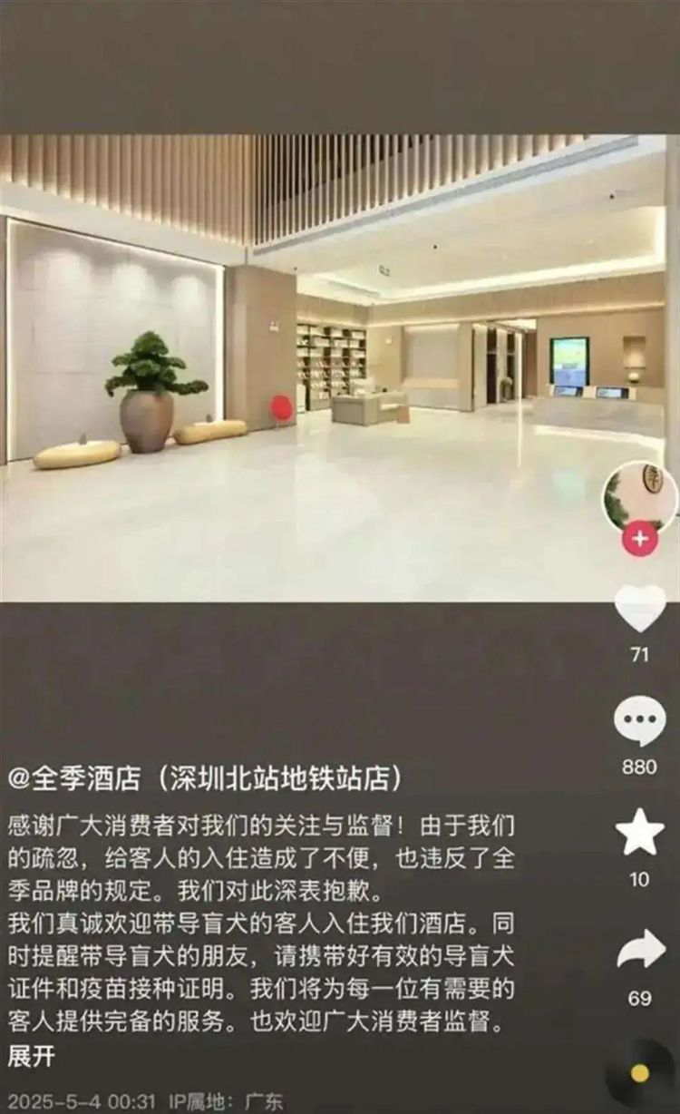 随后,该酒店发布道歉公告称,由于疏忽,给客人的入住造成了不便,也违反了品牌的规定,对此深表抱歉,真诚欢迎带导盲犬的客人入住酒店。另外,酒店所属品牌集团客服表示,旗下从经济型到高档全系列酒店按法律法规均接待导盲犬,目前已经对前述涉事酒店作出处罚。