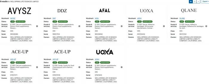 Wellspring Life Sciences Limited持有DDZ、Qlane、UOXA、AFAL等多个保健品商标。