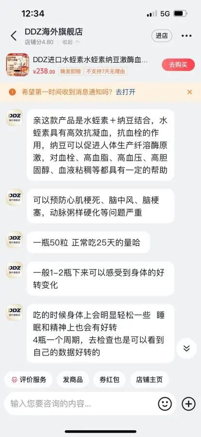 某平台DDZ海外旗舰店官方客服对中新健康表示,DDZ水蛭素是水蛭素+纳豆结合,可以预防心肌梗死、脑中风、脑梗塞、动脉粥样硬化等问题。三项国际权威检查,安全无副作用。