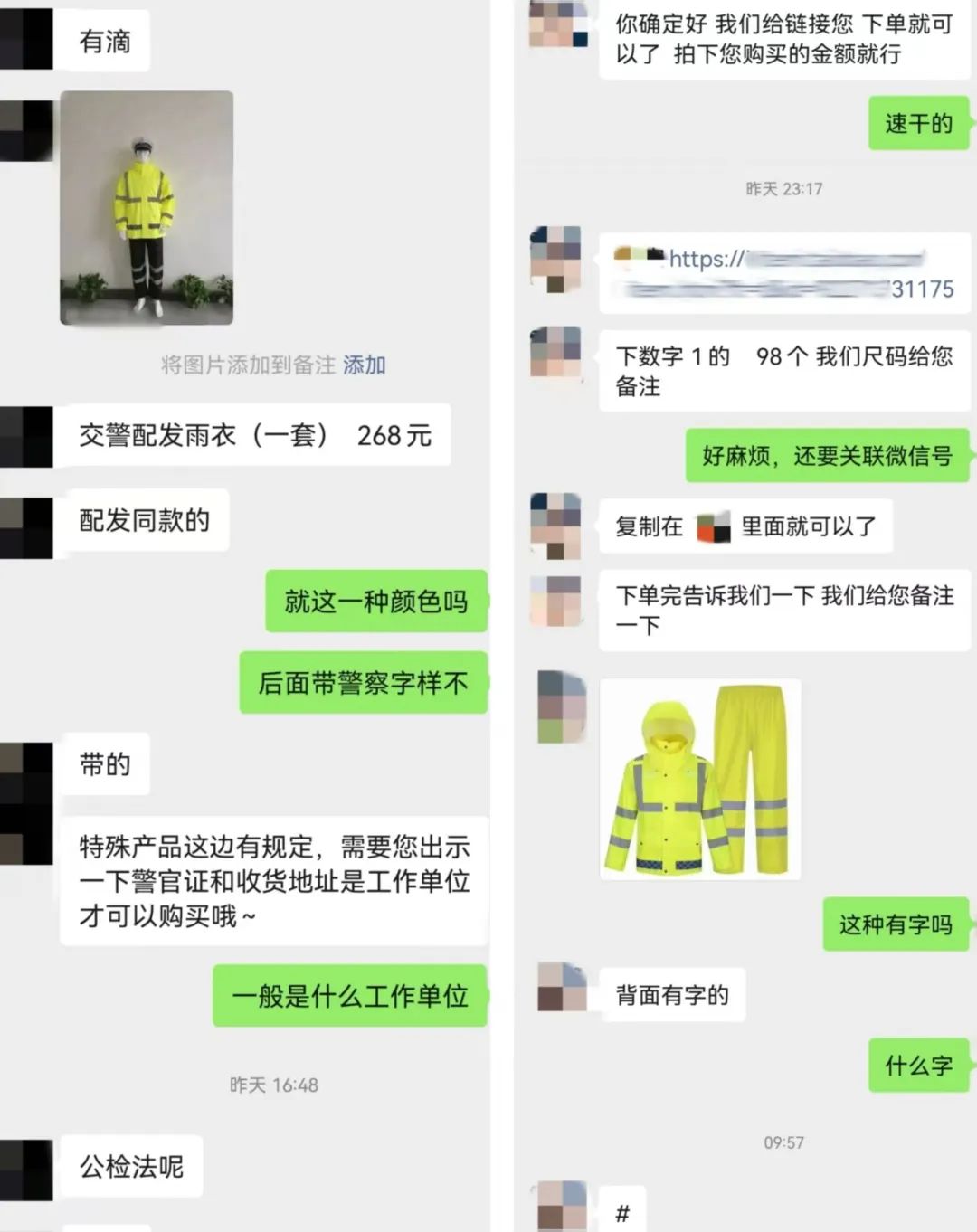 法治网记者通过私信沟通,添加了两名博主的微信。一名博主称购买带有“警察”字样的反光雨衣,需要出示证明警察身份的证件或收货地址为公检法单位。另一名博主在对话中用“#”代替“警察”二字,沟通确定款式尺码后,对方发来网店下单链接,让拍链接里的“1元”商品,数量选98个等于消费98元,对方称下单后会加备注,按沟通好的产品发货。