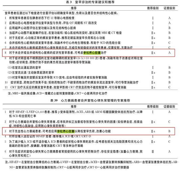同时,对于充血性心力衰竭患者,可考虑应用参松养心胶囊以降低室早负荷,改善心功能(Ⅱa类推荐 B级证据)。
