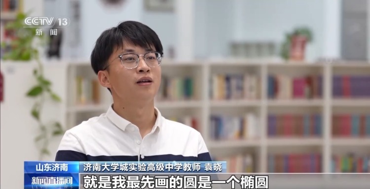 济南大学城实验高级中学教师 袁晓:我最开始教新生,发现上课的时候,其实很多学生并不是能达到百分之百认真听课的。当时事情的转折点是,我那天很神奇地画了一个圆,那一刻学生觉得这个老师好像有两把“刷子”。