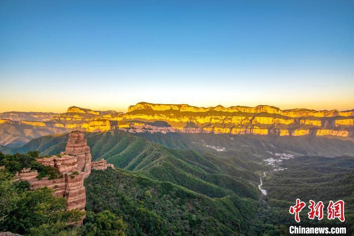 如何惊鸿?瞧,登临高峰,南北绵延数十里,由三层叠起的赤壁红崖,每层高100米至150米,仿若天地初开,雄浑壮观到令人震撼。这就是素有“百里赤壁,万丈红崚”之美誉的嶂石岩地貌。目之所及,25亿年的沧海桑田,还有世界上最古老的化石——三叶虫化石,星光斗转间,一眼“亿年”。